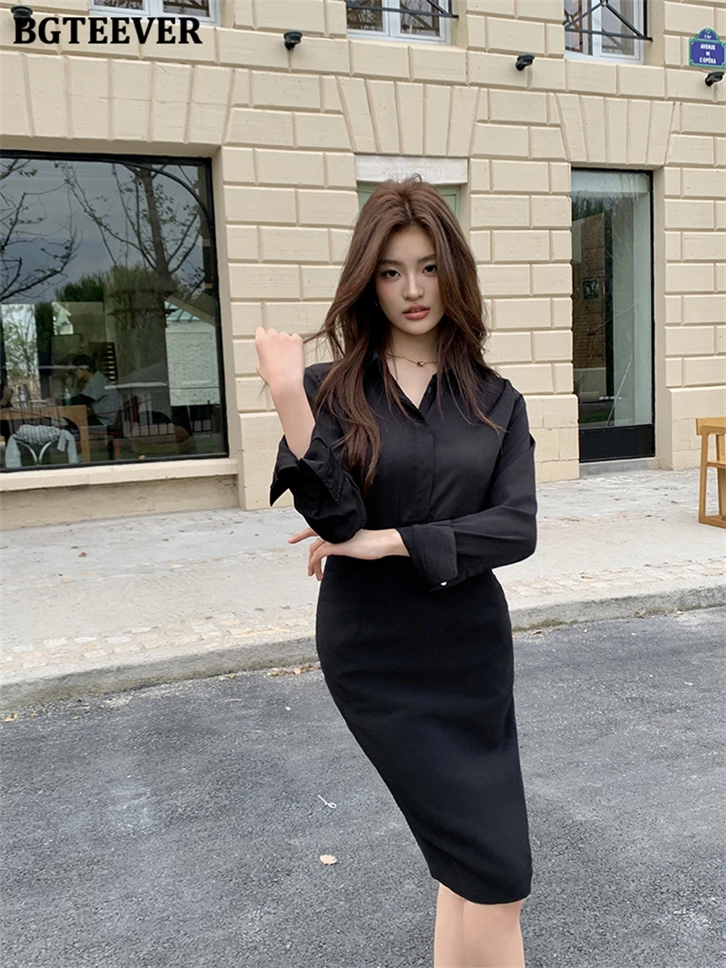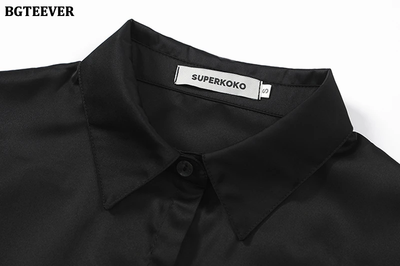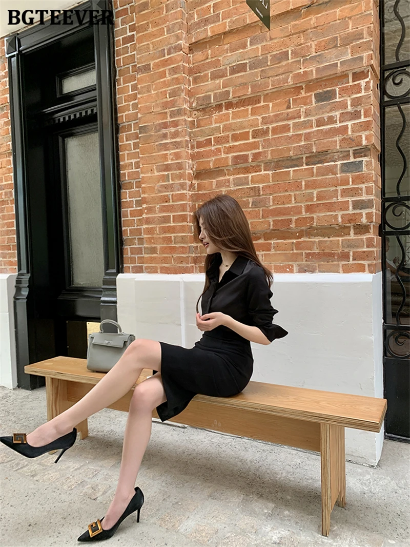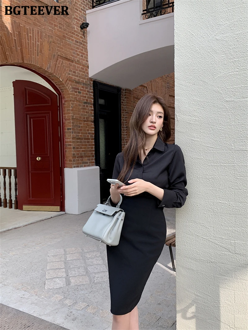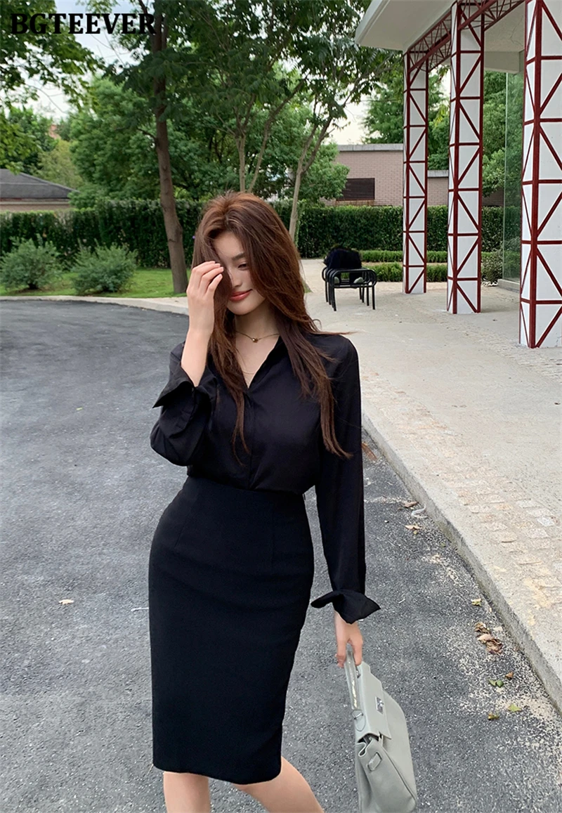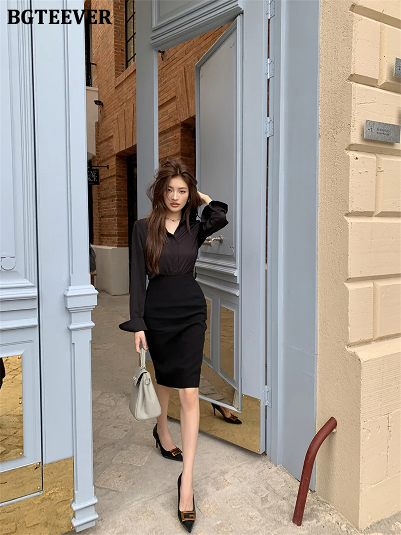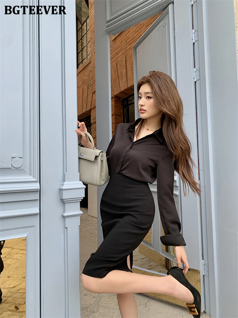 BGTEEVER Spring Summer Slim Ladies 2 Pieces Set Elegant Single-breasted Loose Shirts Blouses & Package Hip High Waist Skirts